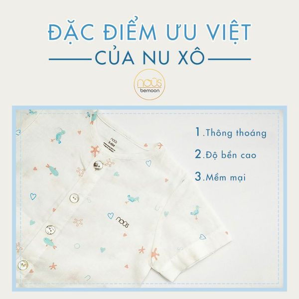 Sản phẩm làm từ chất liệu Nu Xô có kết cấu dệt mở, cho phép không khí lưu thông dễ dàng qua từng nốt vải. Vải Nu Xô không chỉ giúp cho bé tránh bị bí trong mùa hè mà hơn thế chất liệu này còn có khả năng góp phần giữ ấm cơ thể trong mùa đông khi kết hợp cùng các sản phẩm khác.