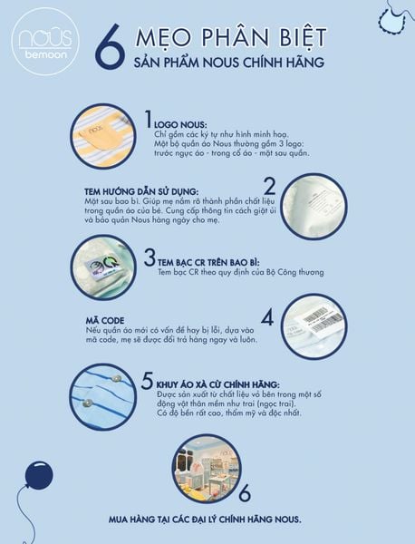 Trên bao bì Nous chính hãng luôn có tem bạc CR theo quy định của Bộ Công thương.Tem CR chứng nhận sản phẩm đủ điều kiện lưu hành, đáp ứng tiêu chuẩn về sản phẩm may mặc cho trẻ em tại Việt Nam. Tem này sẽ giúp mẹ tự tin mua được hàng Nous chính hãng.