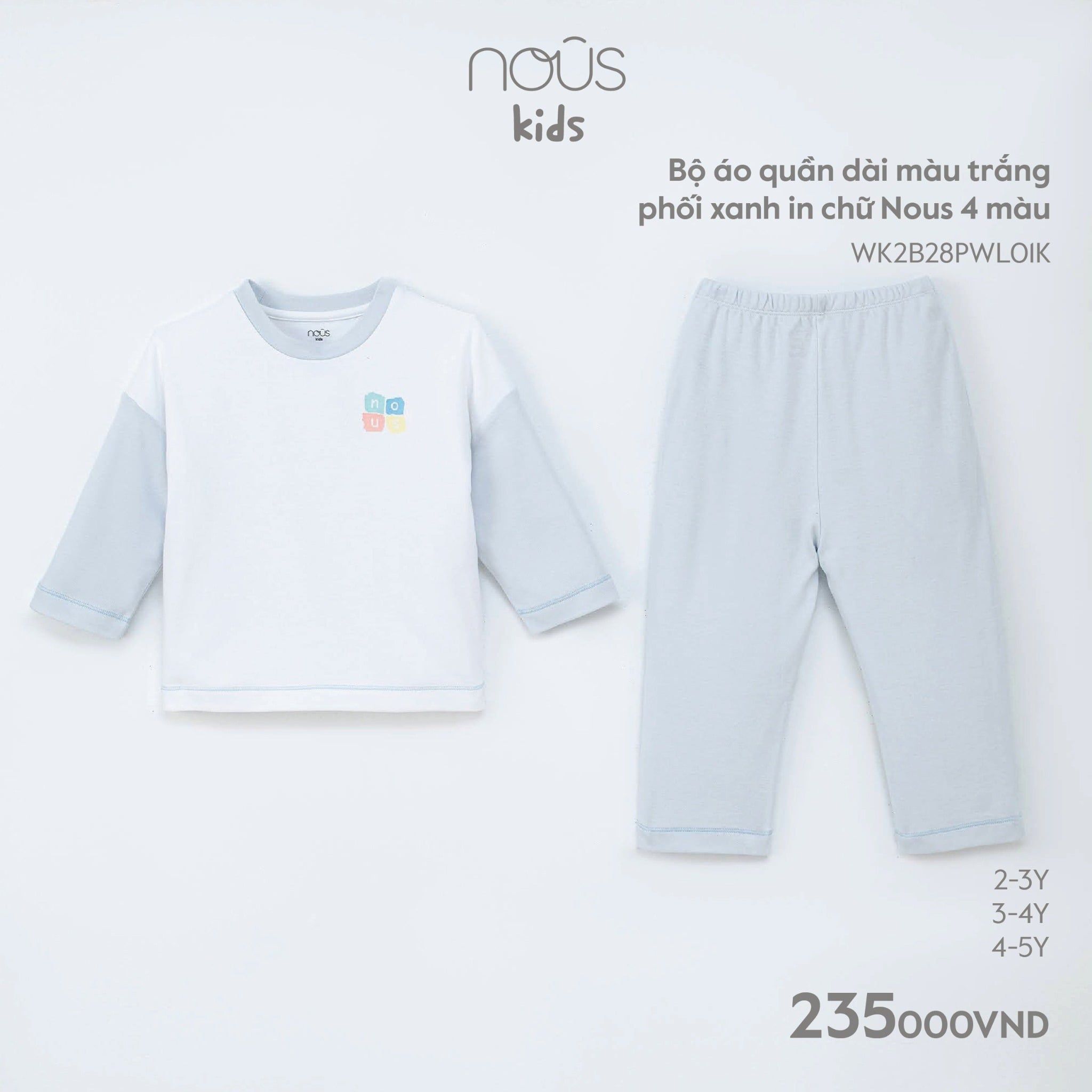 Bộ áo quần dài Nous Kid màu trắng phối xanh in chữ Nous 4 màu