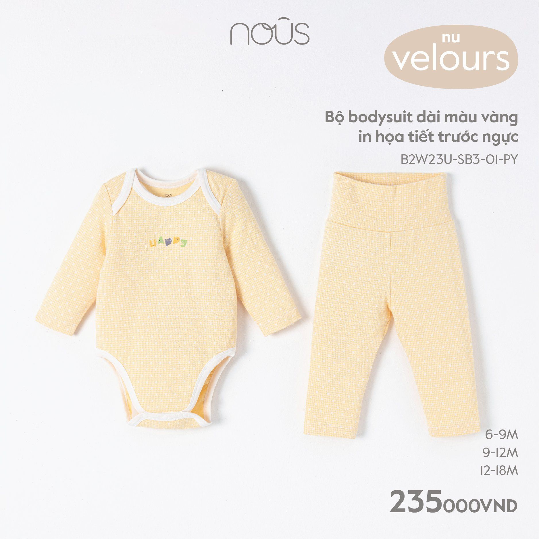 Bộ bodysuit dài Nous velours màu vàng in họa tiết trước ngực