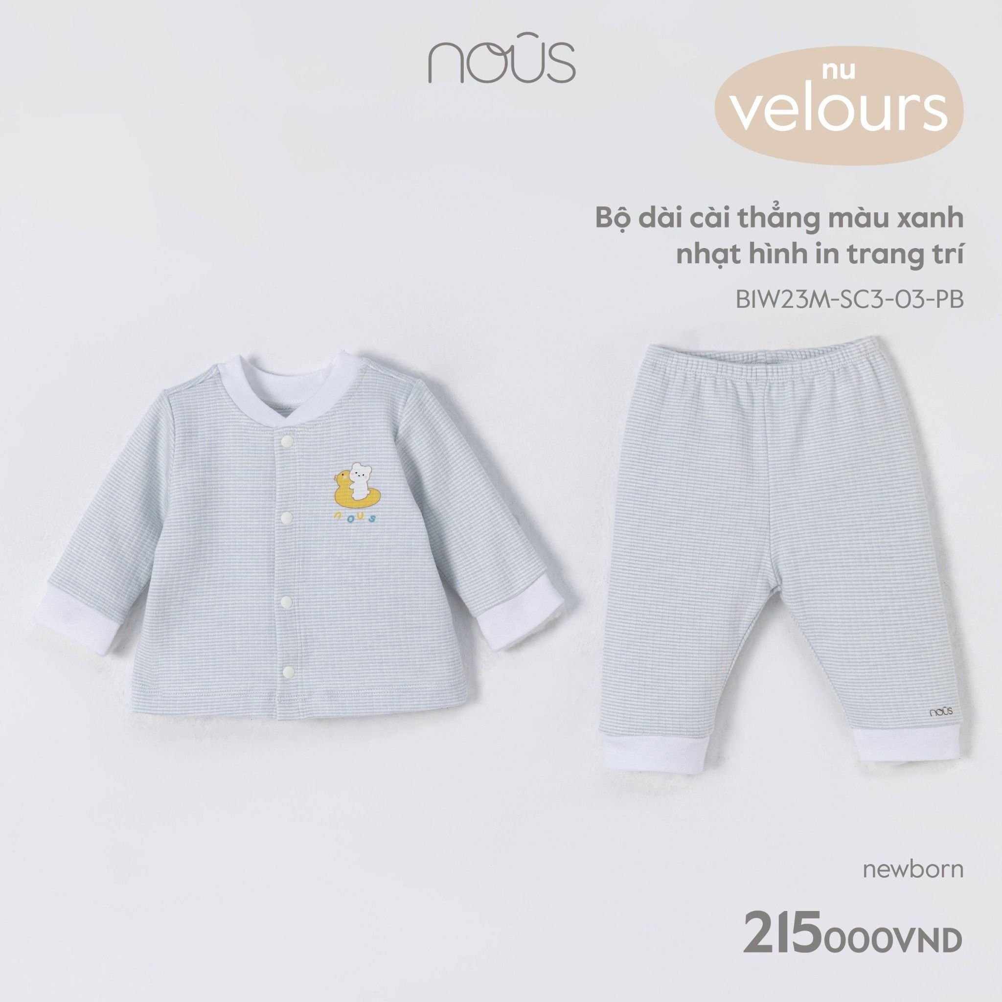 Bộ cài thẳng sơ sinh Nous velours màu xanh nhạt hình in trang trí