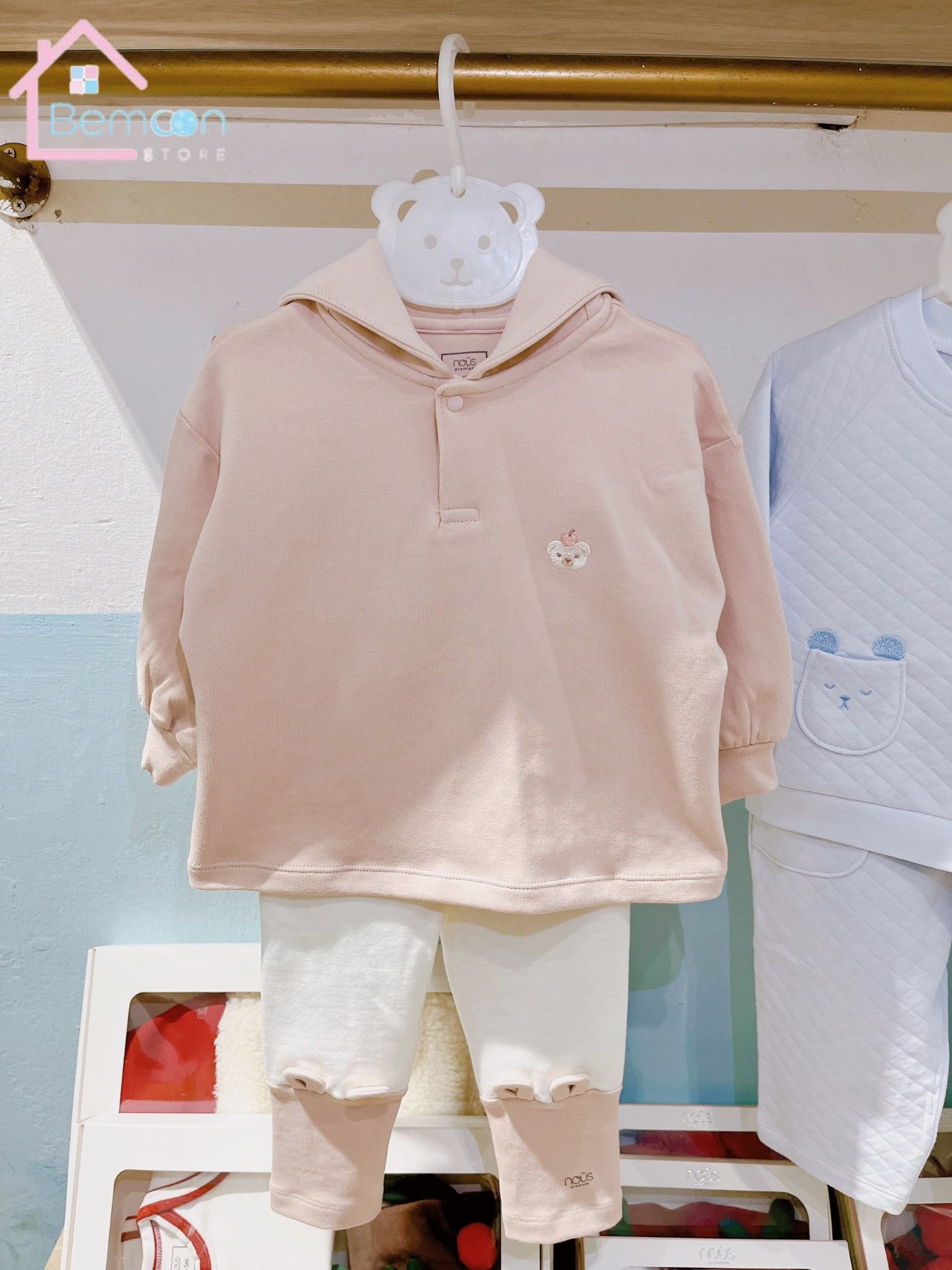 Bộ dài tay áo có mũ màu hồng phối quần trắng Nous ( Gấu táo )