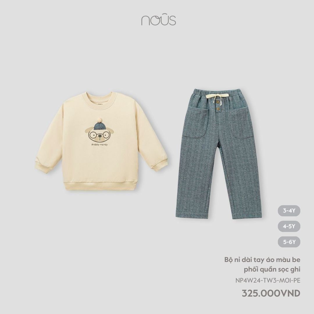 Bộ nỉ dài tay Nous Kid áo màu be phối quần sọc ghi