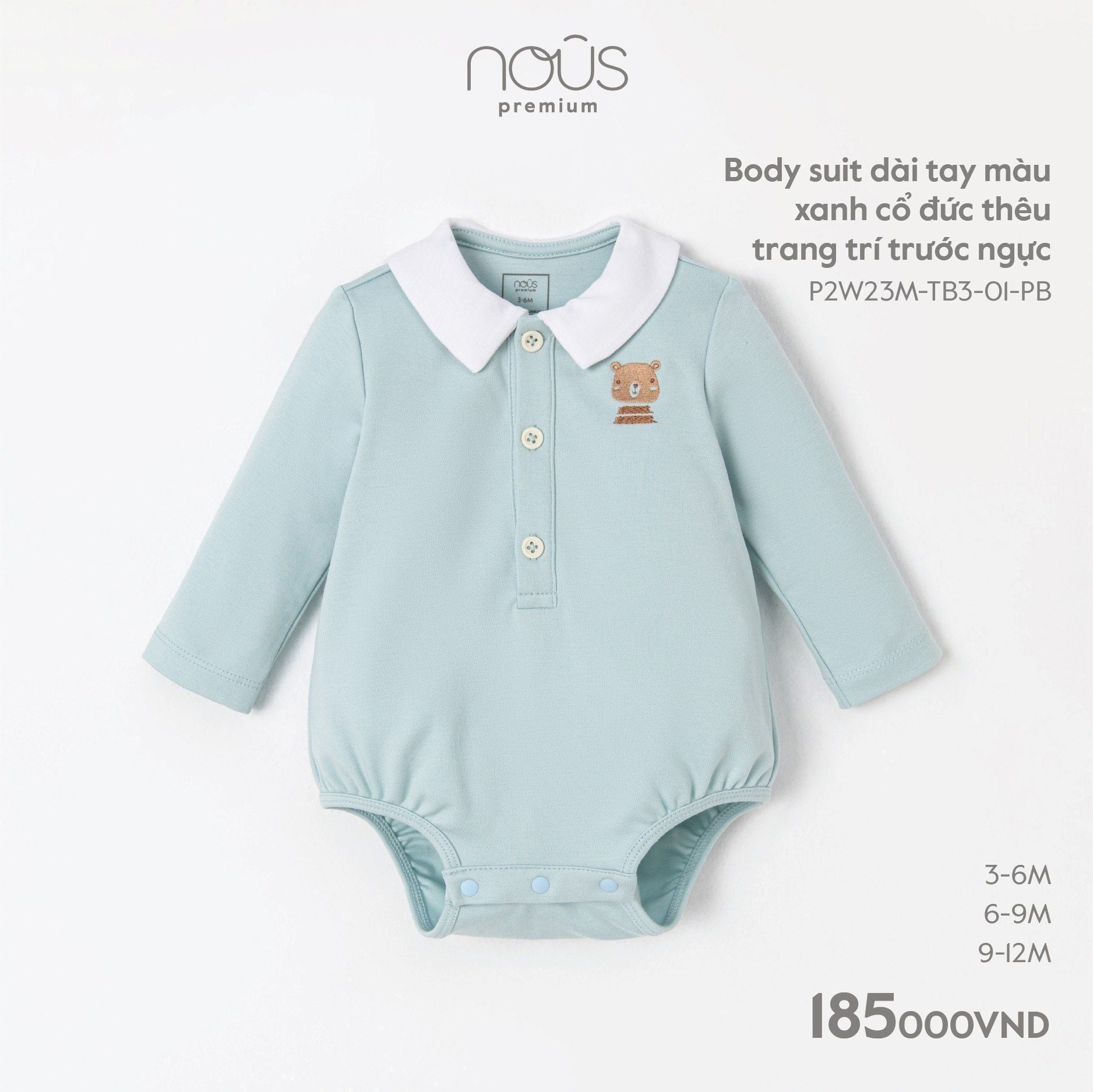 Bodysuit dài tay Nous premium màu xanh cổ đức thêu trang trí trước ngực