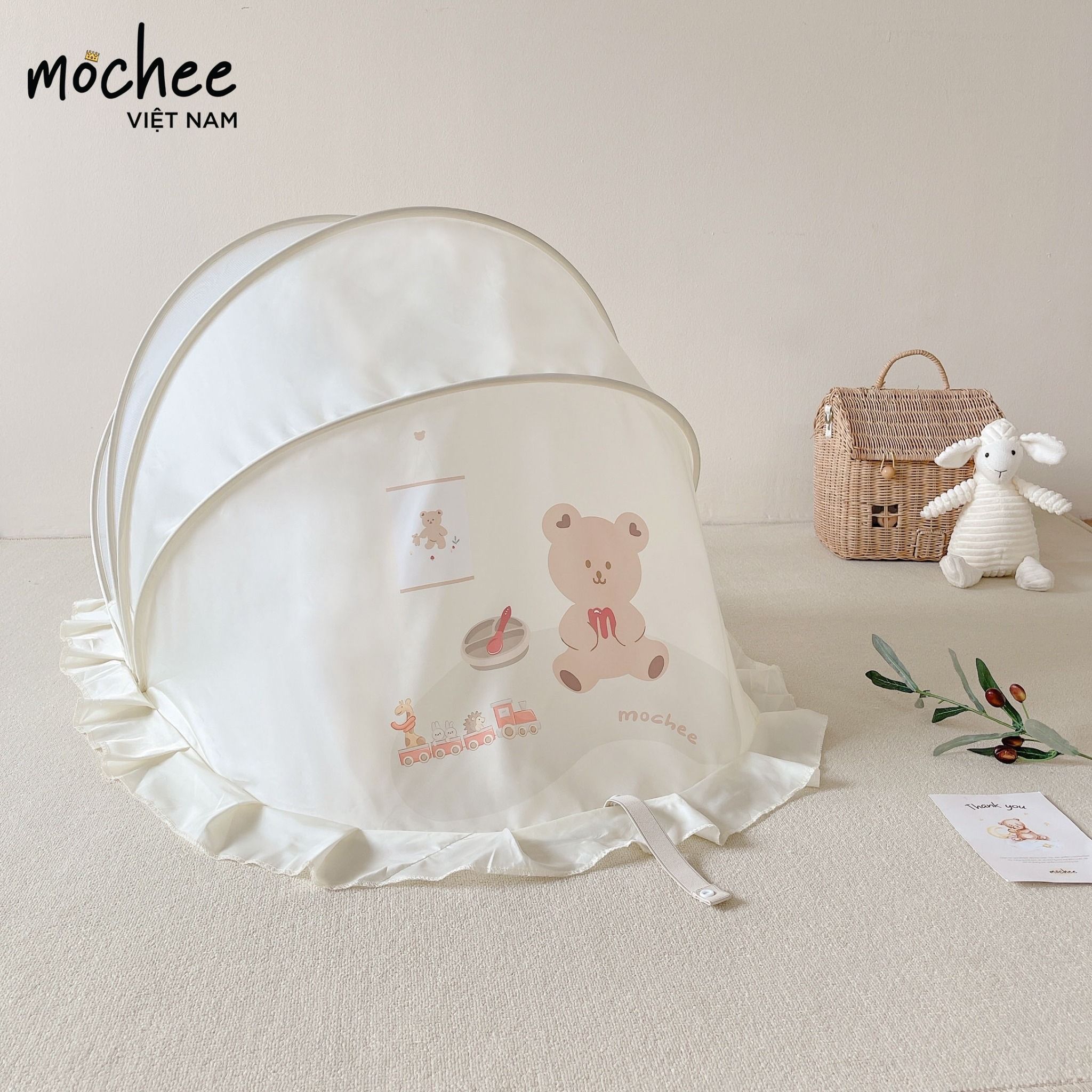 - Làm từ sợi vải tuyn dày, sợi vải có độ mềm nhất định và mắt lưới chống muỗi tấn công, đồng thời tạo độ thông thoáng khí cho bé khi ngủ.