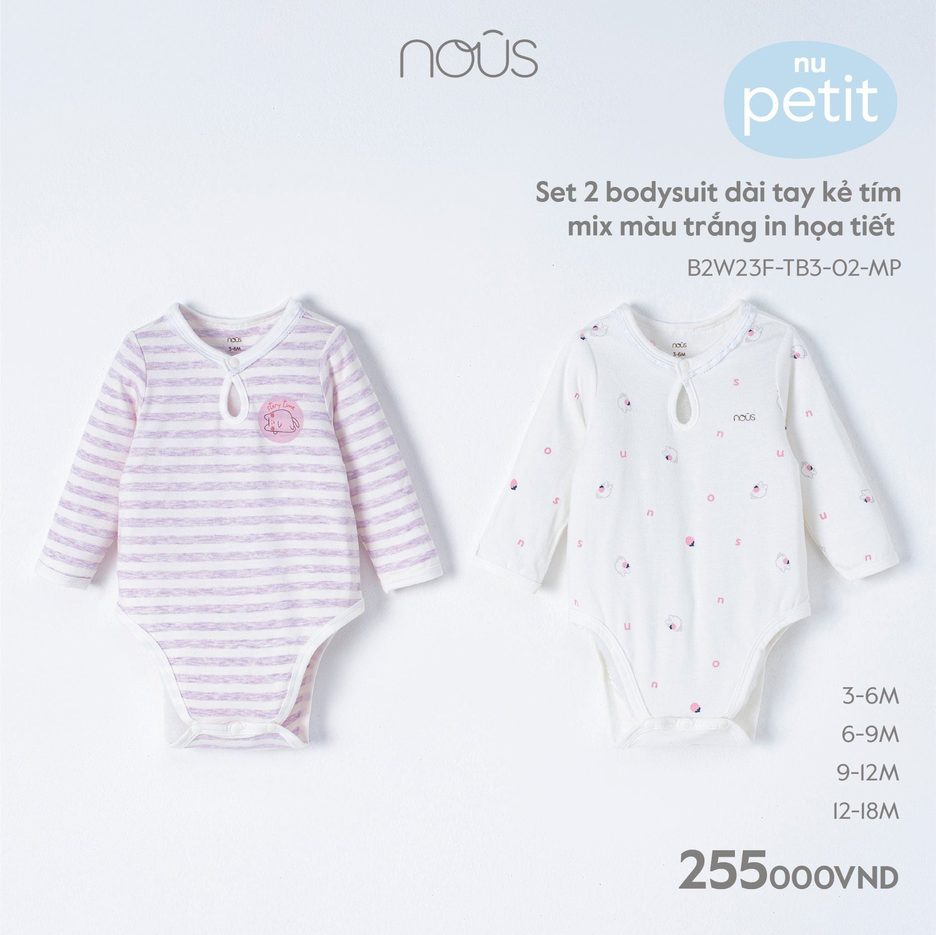 Set 2 bodysuit dài tay kẻ tím mix màu trắng in họa tiết