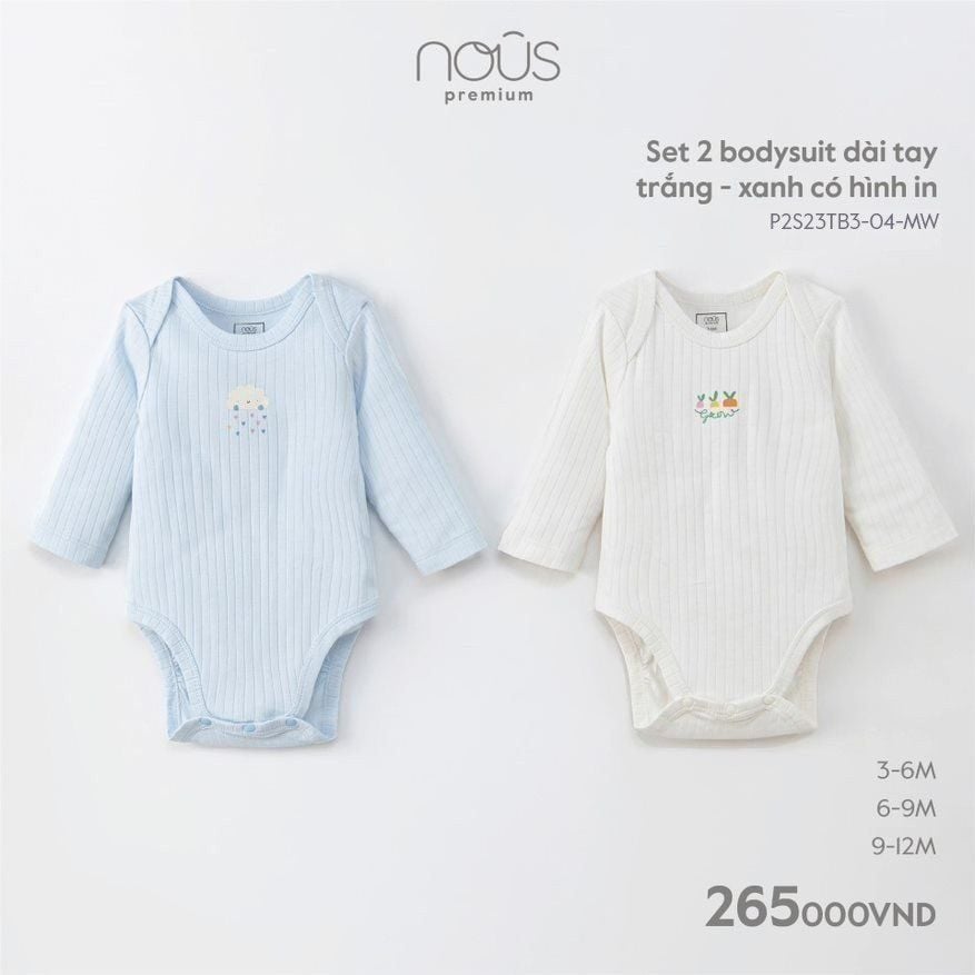 Set 2 bodysuit Nous Premium dài tay trắng - xanh có in hình