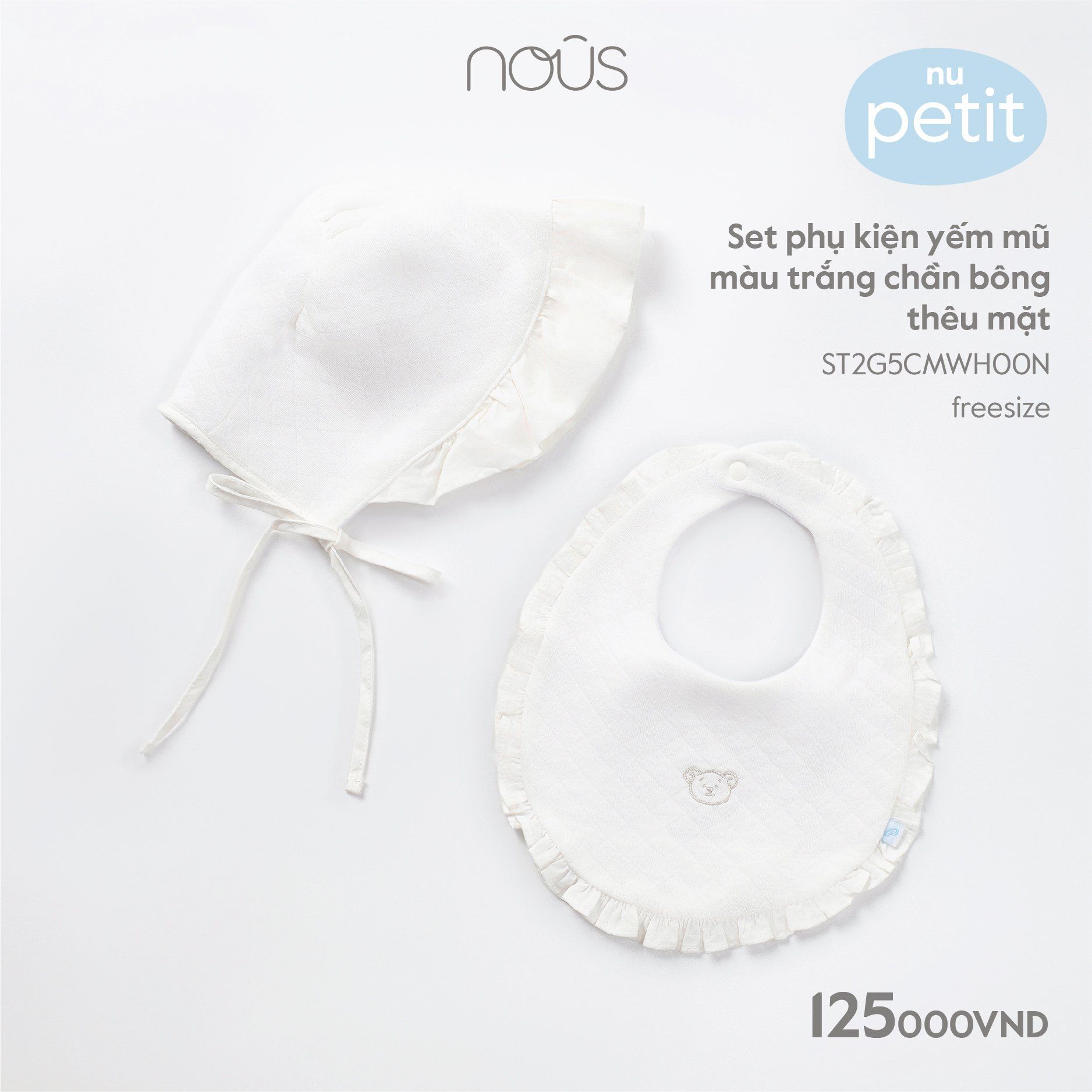 Set phụ kiện Nous yếm mũ màu trắng chần bông thêu mặt gấu